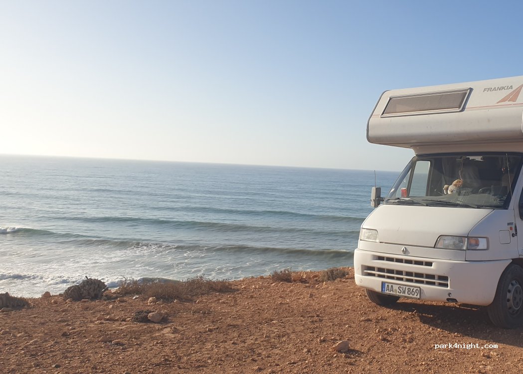 Einer der schönsten Plätze, die wir in Marokko gefunden haben! Absolute Ruhe, bis auf das Meeresrauschen. Man kann von hier aus zum Strand runterwandern oder einfach den Blick aufs Meer und die beiden Buchten genießen. Abends kommt leider die Polizei und schickt einen Weg, da man hier nicht übernachten darf. Auf Diskussionen haben sie sich nicht eingelassen. Wir sind dann ein Stück zurück gefahren und haben bei „Chez M‘Barek“ (Google) übernachtet. Das ist ca. 3 Buchten weiter.