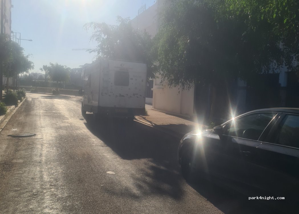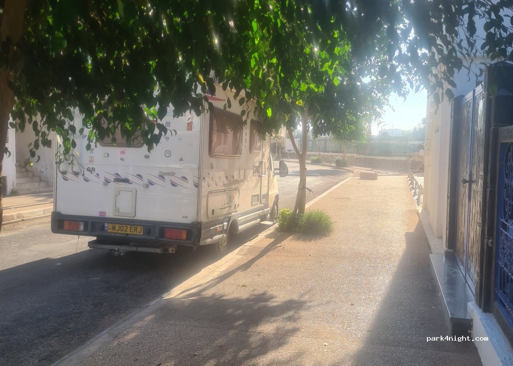 Quiet road near a couple of residences. Residence Yasmina is nearest point for GPS. Road is Rue De La Jeunesse. No restrictions, general store just across the road and Uniprix not far away with bigger selection Inc beer wine etc. 5 min walk to centre agadir corniche, tourist info office numerous shops bars clubs beach etc.