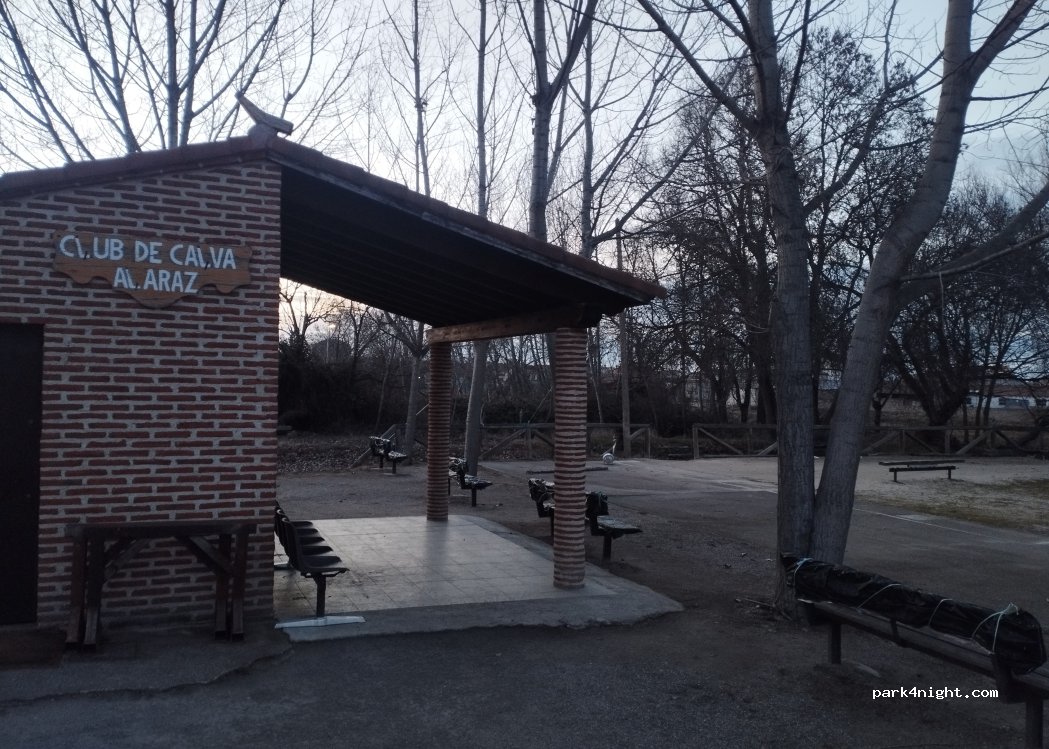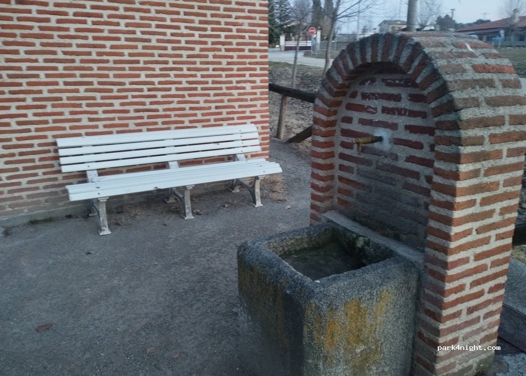 hay una fuente de agua (no potable) pista de juego de calva con arboles y bancos