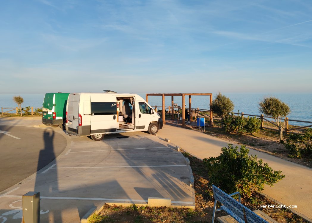 Spot sympa en bord de mer avec vue magnifique. douche froide et plusieurs robinets d'eau sont à disposition ainsi que des tables de picnic. Un peu bruyant le matin car c'est au bord de la petite route du littoral mais avec les éboueurs qui viennent tôt et les chiens des maisons qui font du bruit une partie de la nuit ça ne conviendra pas à tout le monde. Hors saison nous étions 2 sur le parking.