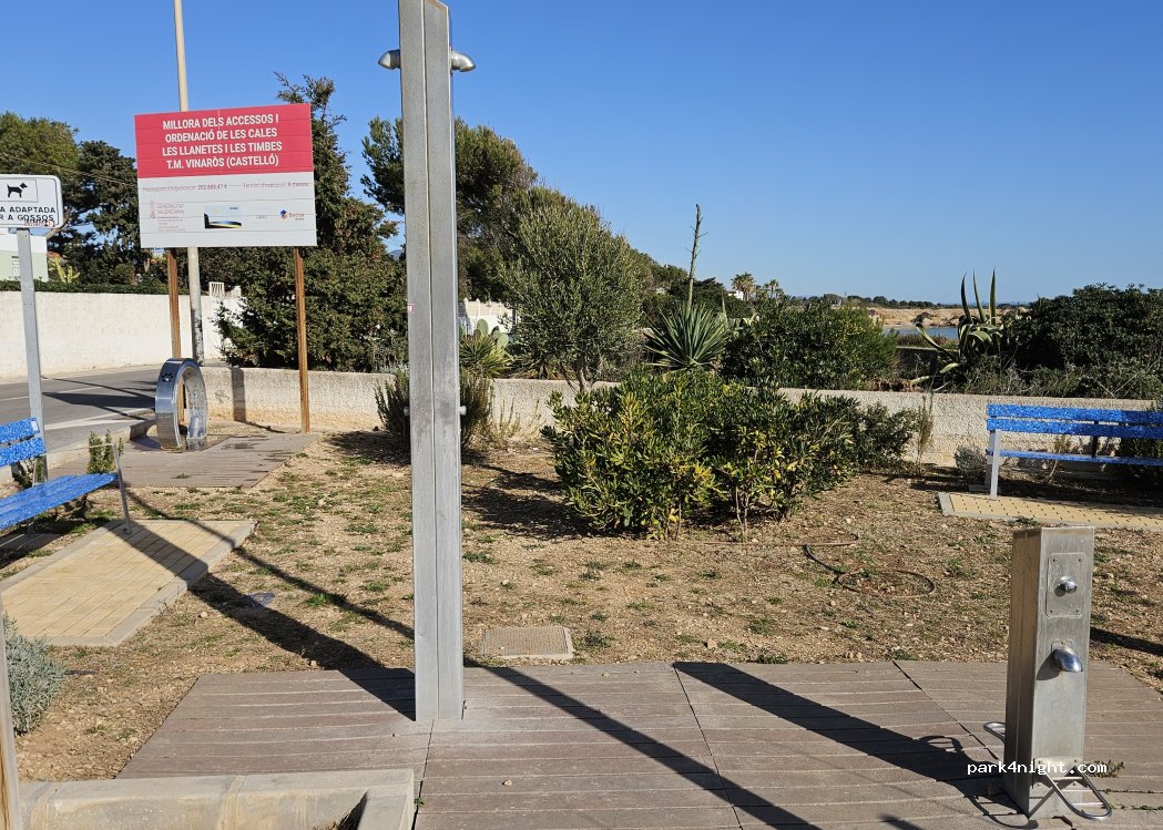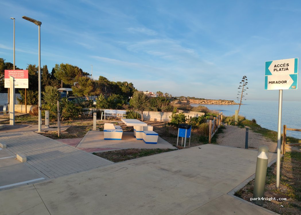 Solo campers pequeñas; se trata de un estrecho aparcamiento, junto a la carretera y playa para perros, bien delimitado para coches, y cualquier autocaravana un poco grande simplemente no cabe. Y lógicamente no es cuestión de ocupar más de una plaza. El camión de la basura pasa muy justo, casi rozando las plazas. Unos 500m más al norte, en la curva, hay otro parking más amplio
