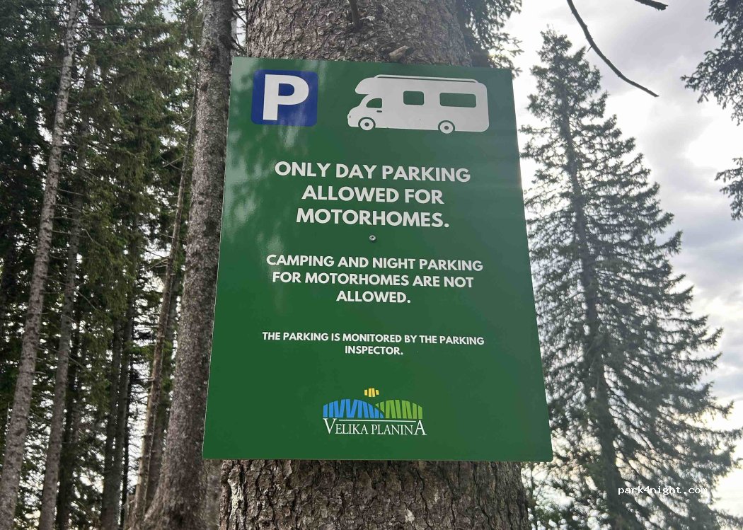 Nove se tu neda prespat, cedule zakaz overnight na vsech třech parkovištích na Velke Planine, vcetne tohoto, prvniho, nejvetsiho. 30eu/obytnak za parkovani pouze pres den. 10eu/osobni auto. Doporucuji stat na 2.parkovišti, je mnohem vice v rovine a lepe situované, jen musite cca 2km po sterkove ceste.
