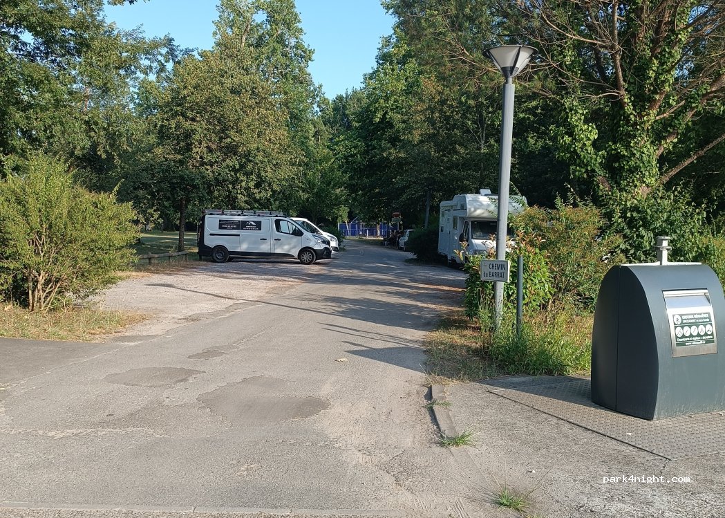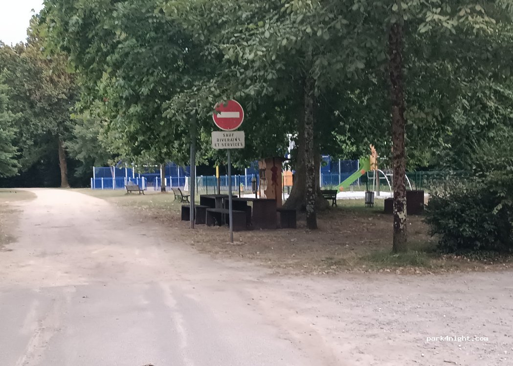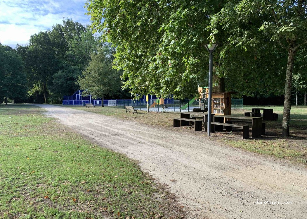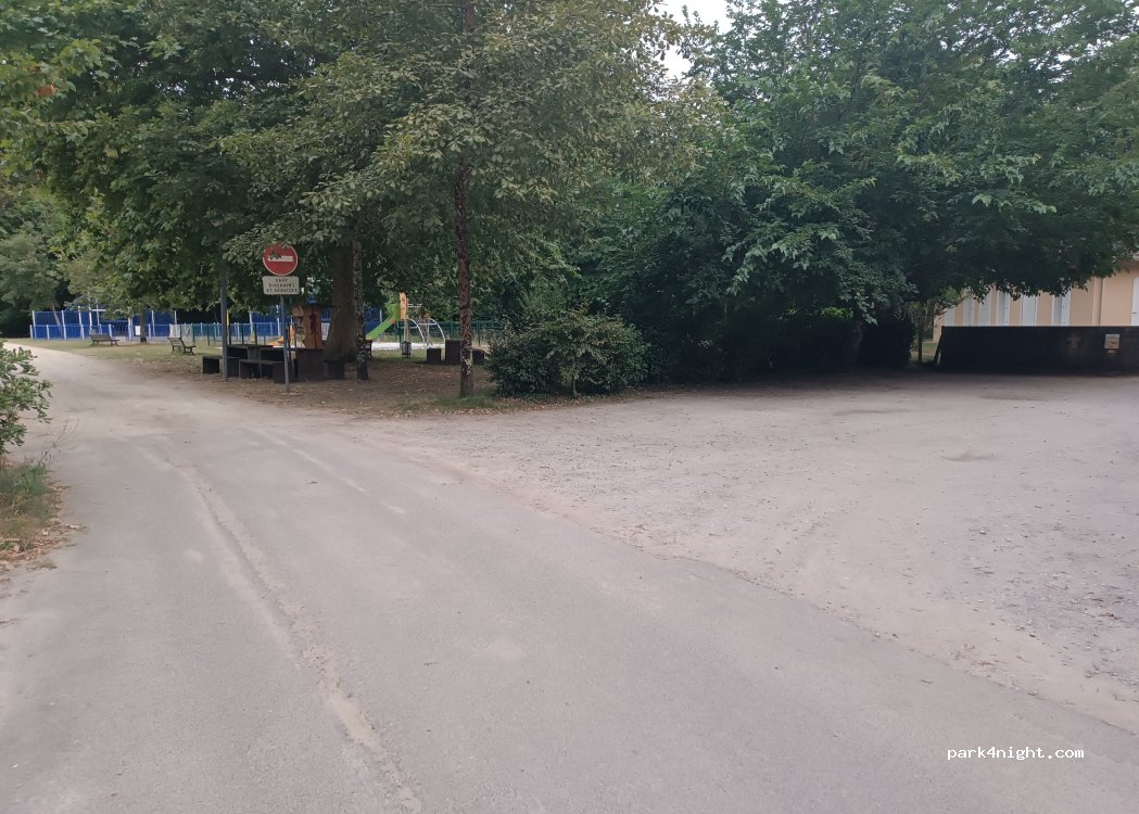 Parking vraiment bien près d'un grand parc arboré avec jeux pour enfants et boîte à livre. Nous sommes arrivés à minuit et il était facile à trouver. Il manque juste des WC c'est pourquoi j'ai mis un 4. Les chiens étaient ravis de pouvoir se balader après une nuit dans le van.