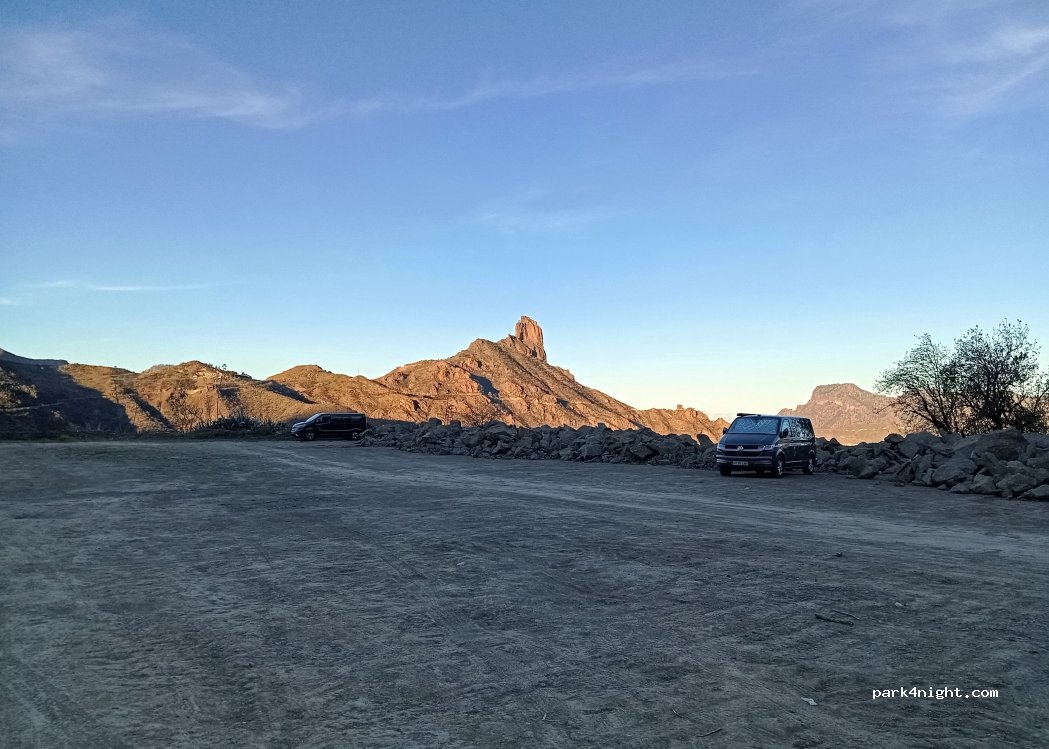 the parking place is huge and you have a great view. We were the only car there. But it's also a place to store material for building sites. At 7am In the morning big machines moved around to pick up stones. So maybe only recommendable for weekends or for early birds.