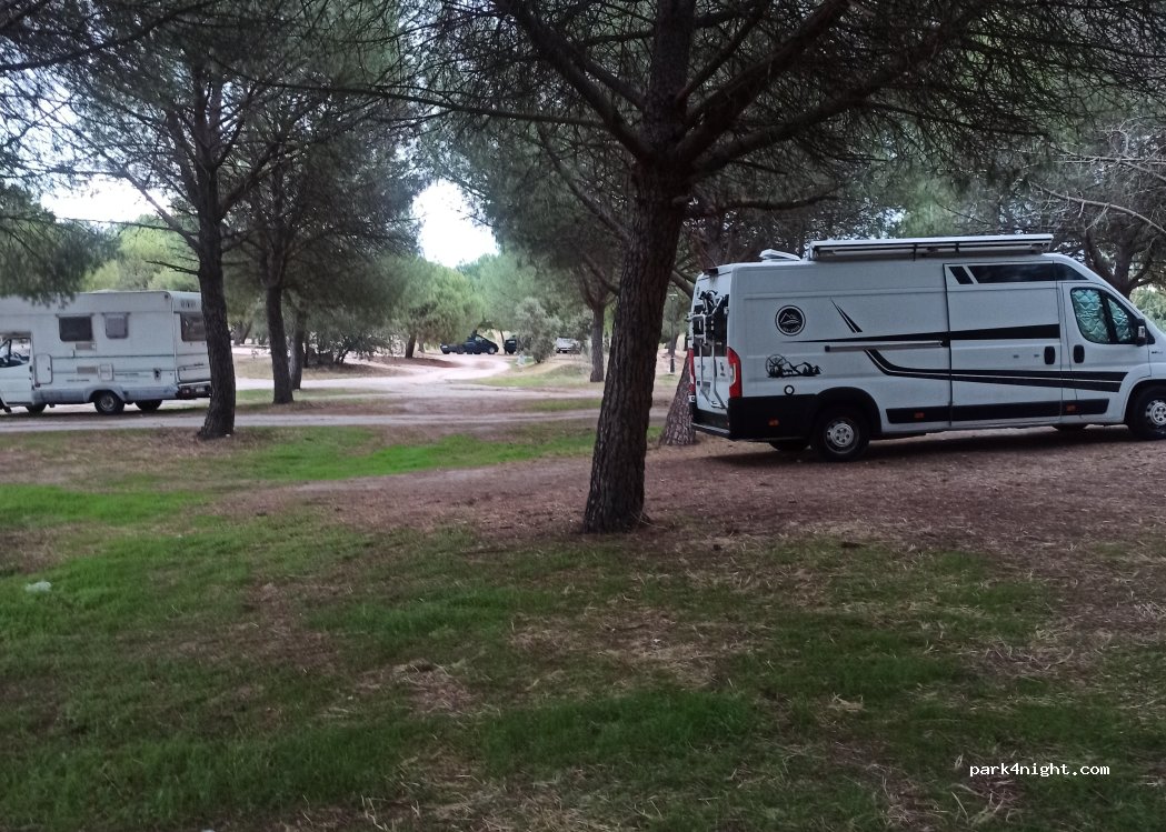 Noche tranquila con mucho aparcamiento bajo los pinares. lago cerca con paseo alrededor de él. varios chiringuitos, duchas...
