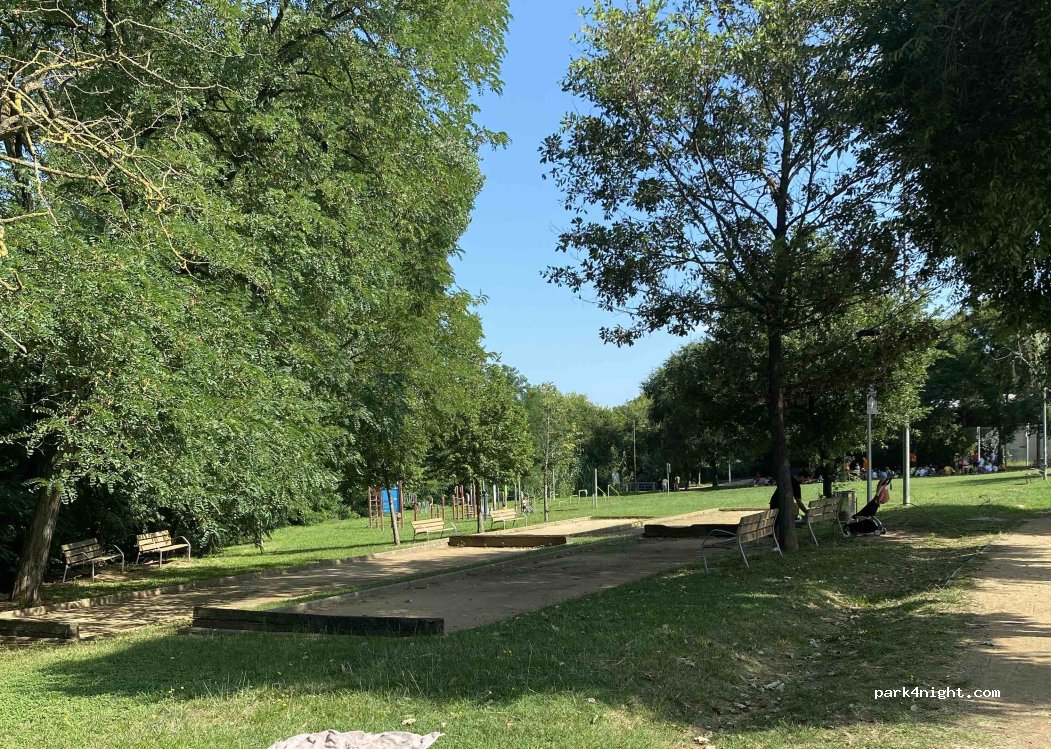 Simple stationnement mais à côté d’un parc avec petite plaine de jeu, équipements de sport en plein air et bancs à l’ombre des arbres :)