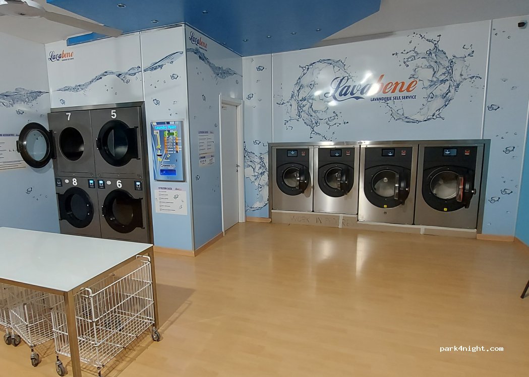 Lavanderia self-service con 2 lavatrici da 15 kg, 2 da 10 kg, 4 asciugatrici (10 minuti) e una lavatrice e un'asciugatrice ciascuna specifica per coperte per animali domestici, ecc. Il parcheggio è disponibile proprio fuori, anche per i campeggiatori più lunghi.