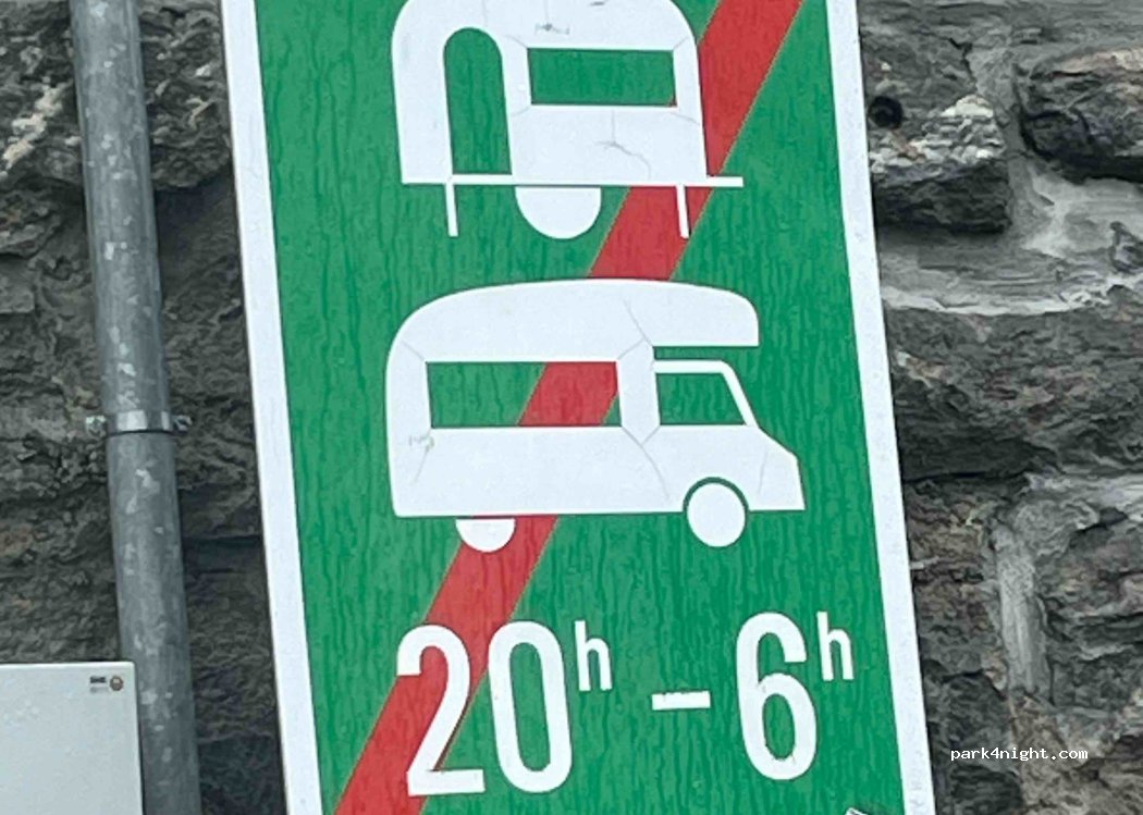 Free parking is perfect for visiting the town during the day, even for 7m AC units. From 8 pm to 6 am, there is a specific sign prohibiting overnight parking. Close to shops, restaurants, and a supermarket.