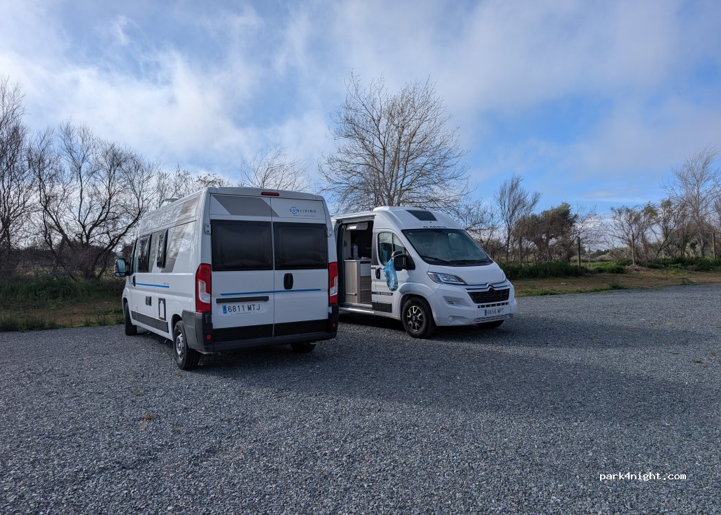 Zona de estacionamiento cerca del embalse. Es un parking de grava, pero bastante llano. Al lado hay un parque de kalistenia. Sitio muy tranquilo para descansar.