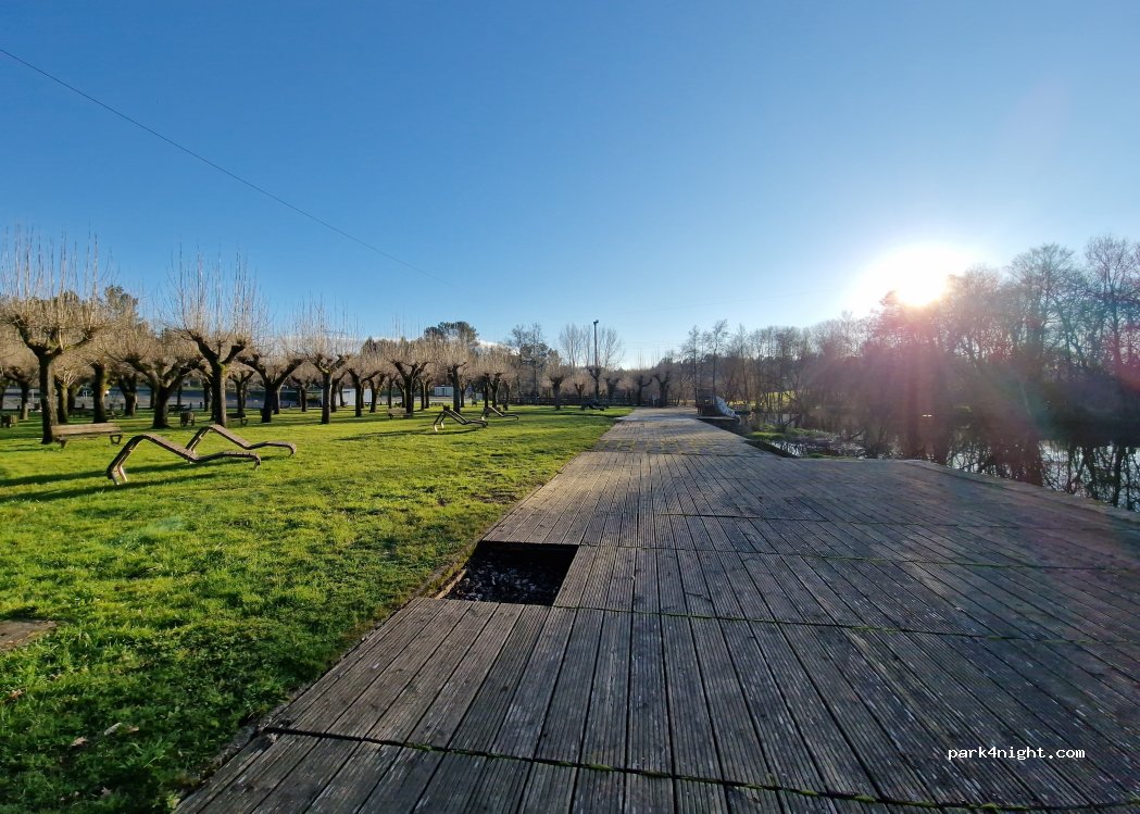 Parking ensoleillé et ombragé et calme pour se reposer et passer la nuit, nombreuses aires de pique-nique, pelouses, balançoires, plage fluviale, piscines publiques gratuites. kiosque avec des sandwichs à la crème glacée bon marché et des commis très sympathiques. wifi : JUIWI FURELOS mot de passe : concellodemelide