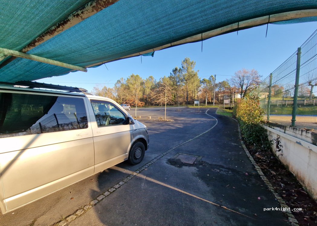 el parking como tal está inclinado, pero justo al lado hay una zona de césped y árboles que no es un parking como tal pero está muy bien para pasar la noche. Plano y rodeado de naturaleza, al lado del río y las piscinas.