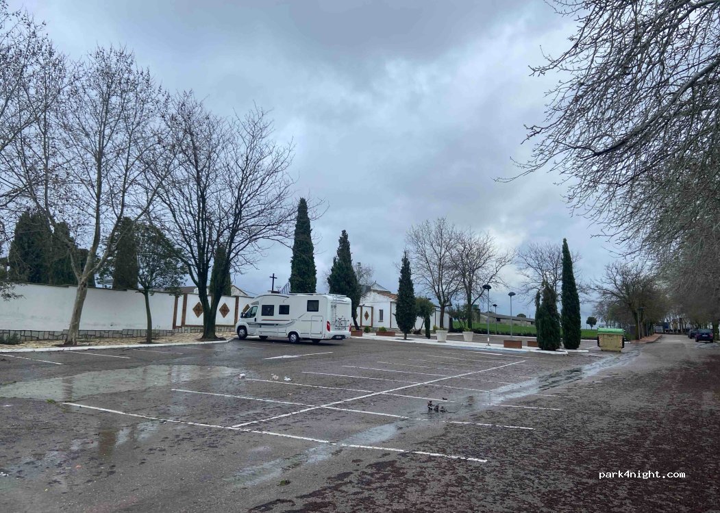 Aparcamiento del cementerio: dos amplias zonas asfaltadas, resguardadas del viento, muy tranquilas gracias a su ubicación a unos 200 m de la carretera. Accesible para todo tipo de autocaravanas (la mía mide 7,40 m). Sin restricciones de aparcamiento visibles. Una excelente opción cuando hay demasiado barro para dormir en la bonita ermita, justo al lado.