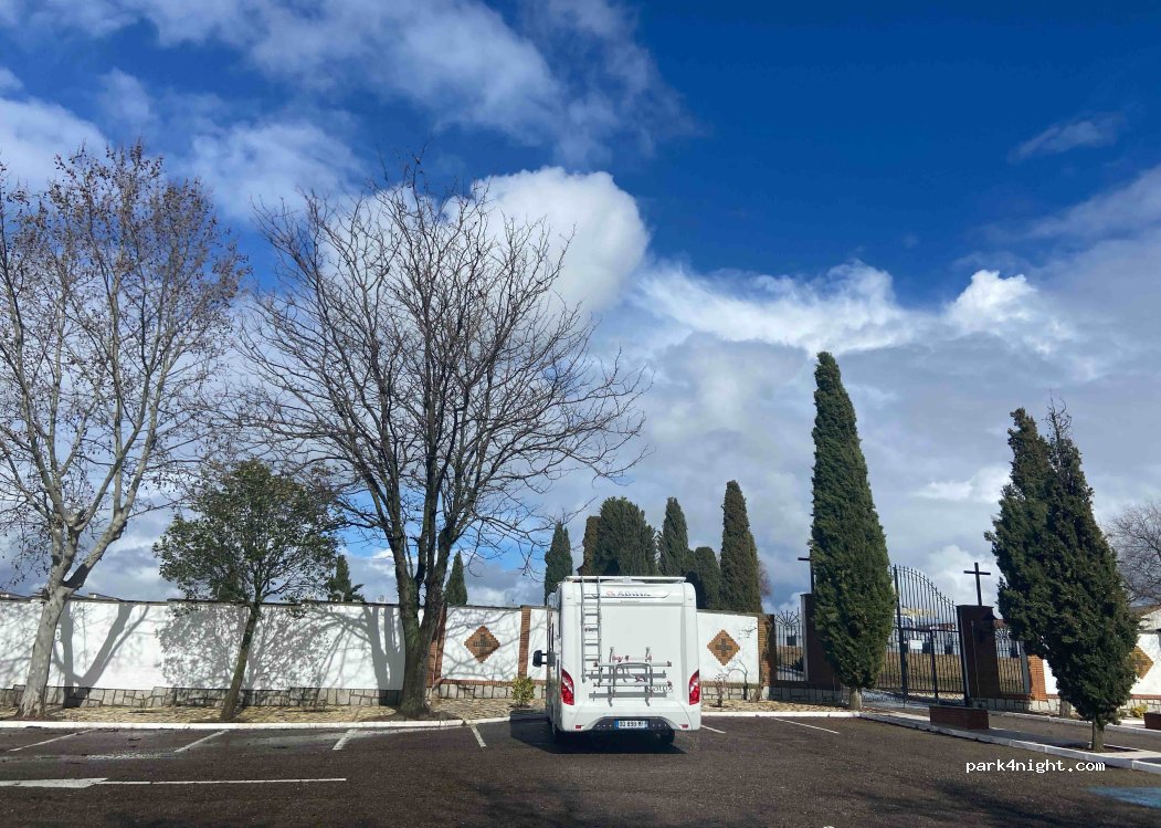 Cemetery parking: two large tarmac areas, sheltered from the wind, very quiet because they are about 200m from the road. Accessible to all types of motorhomes (mine is 7m40 long). No visible parking restrictions. A very good option when it's too muddy to sleep at the pretty hermitage, right next door.