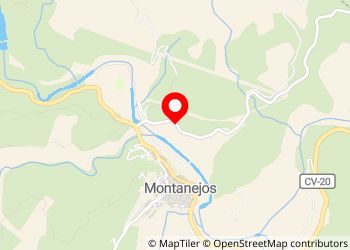 Tres mesas redondas de picnic con asientos de piedra y una fuente de agua no potable. Hay aparcamiento al otro lado de la calle, donde hay un contenedor de basura.