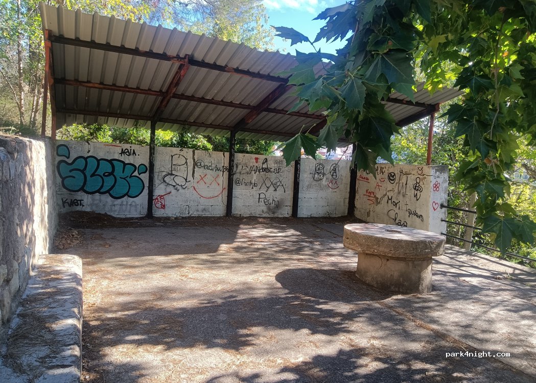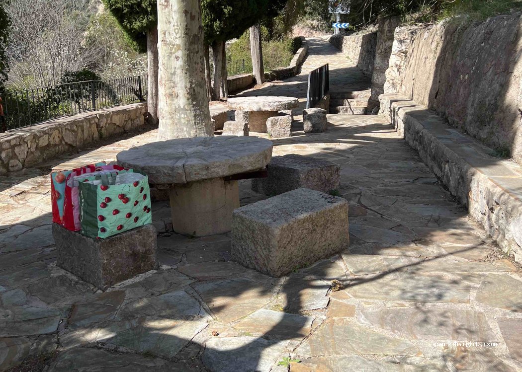 3 tables de pique-nique rondes avec sièges en pierre et une fontaine d'eau non potable. Vous vous garez de l'autre côté de la route, là où il y a une poubelle.