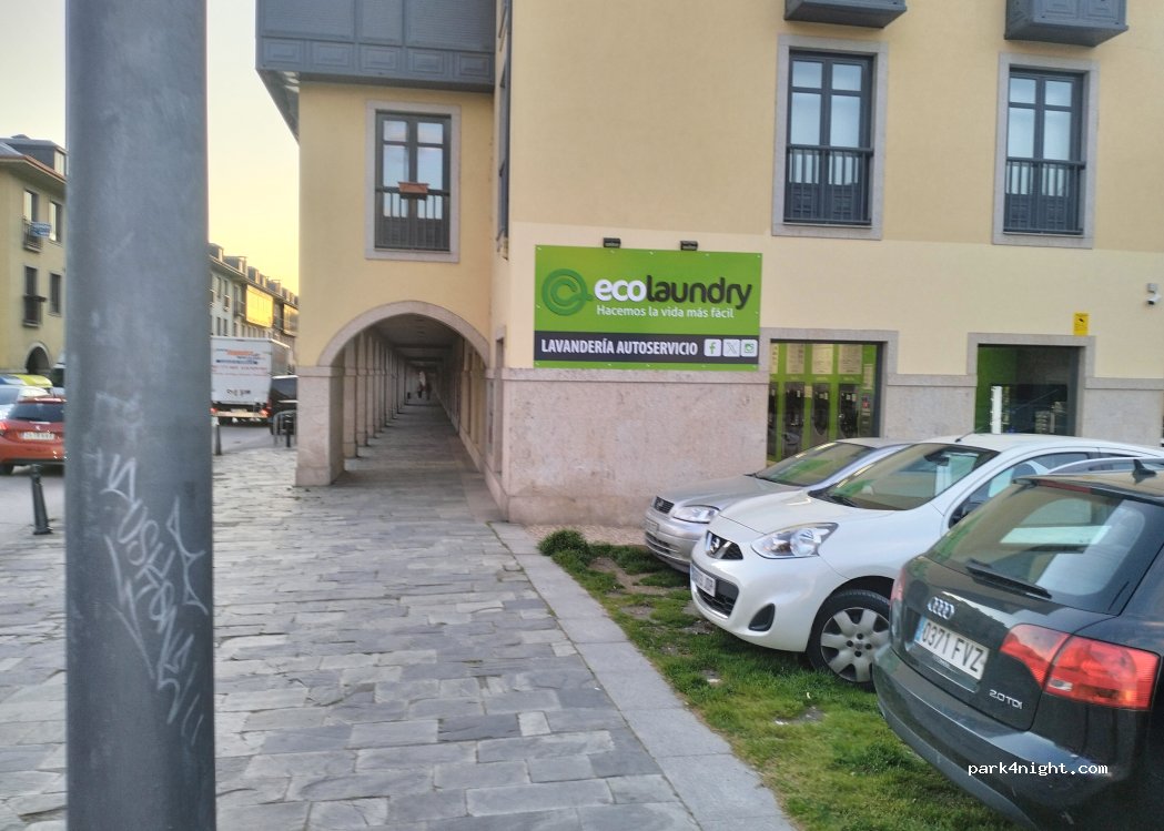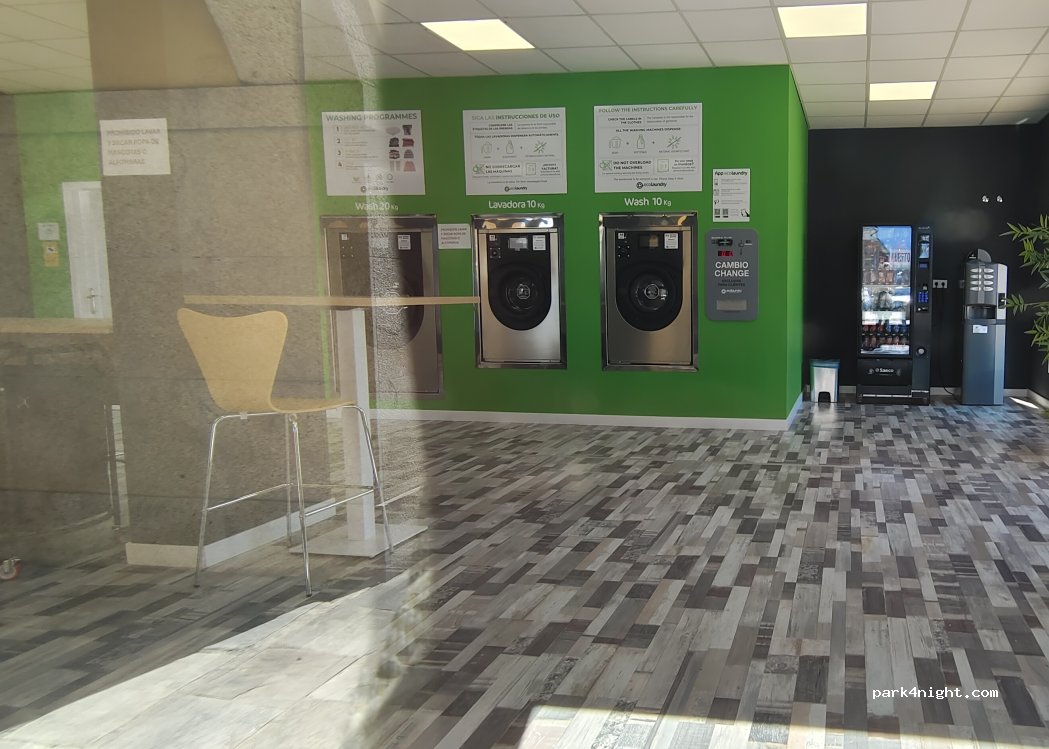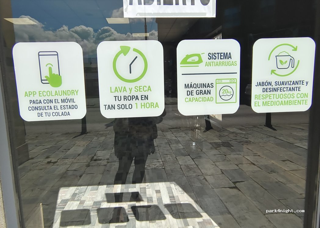 Es lavandería.2 lavadora de 10kg.2 de 20kg y 2 secadoras de 20 kg.Se puede pagar con tarjeta y también da cambio de billete.Tiene makina de café y refrescos.Muy cerquita y muy cómoda y limpia.
