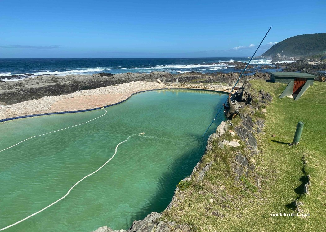 Stormsrivier Mouth Campground in Stormsrivier Ntl Park. Campground with 100 pitches directly along the rocky coast. Every pitch has an ocean view. Open terrain, so full in the wind. No shelter, but the roar of the surf. Every pitch has a braai, electricity and rubbish bin. Sanitary facilities are clean and well maintained. Very few taps. A freshwater swimming pool on the rocks. Watch out for baboons that are after food.
