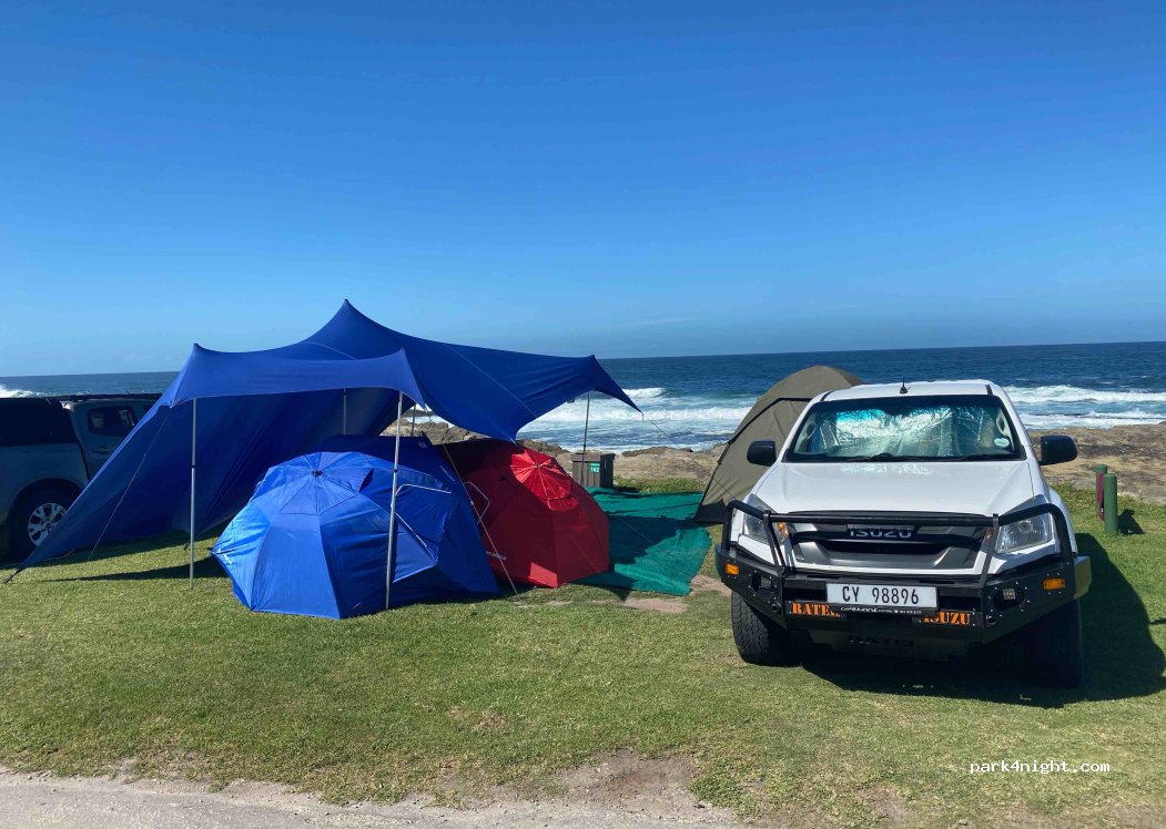 Camping Stormsrivier Mouth dans le parc national Stormsrivier. Camping de 100 emplacements directement le long de la côte rocheuse. Chaque emplacement offre une vue sur l'océan. Terrain ouvert, donc plein de vent. Pas d'abri, mais le rugissement des vagues. Un barbecue, de l'électricité et une poubelle à chaque emplacement. Les sanitaires sont propres et bien entretenus. Très peu de robinets. Une piscine d'eau douce sur les rochers. Méfiez-vous des babouins en quête de nourriture.