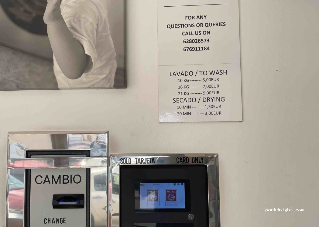 Gibt auch eine Waschmaschine 21 kg für EUR 9. Trockner sind 3 Stück vorhanden. Bezahlung in bar oder per Karte möglich. Einen Stern Abzug, da man nicht gut parken kann.