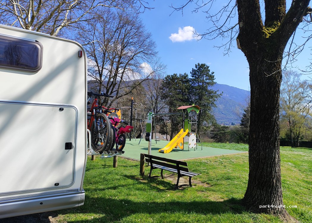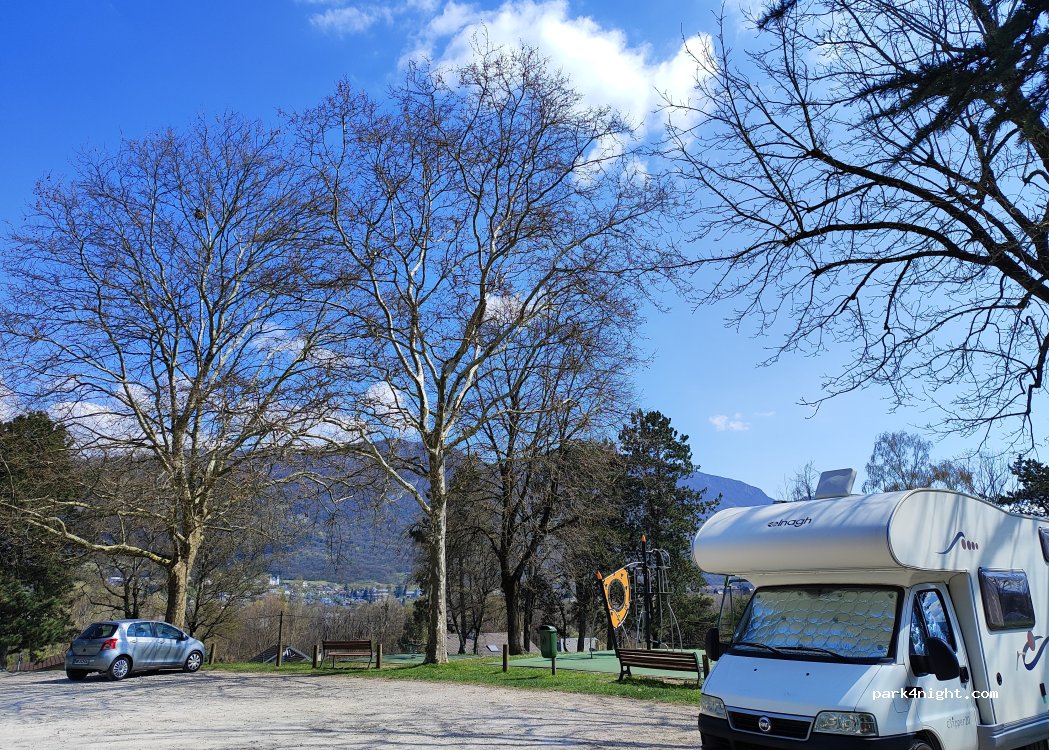 Derrière l'église, le parking est plat et sers beaucoup pour l'école en dessous panneau qui annonce le stationnement interdit après 19h00 mais pratique et sécurisé.