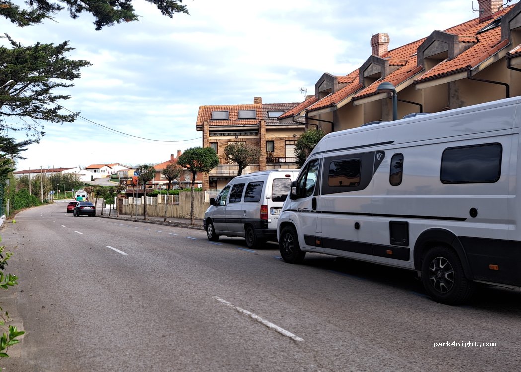Free parking spaces for long vehicles along the houses. Very quiet at this time of year. No height limit. I don't think it's possible to park there in the summer.