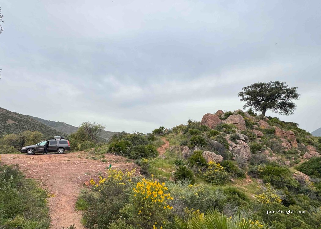 Small, flat area for one vehicle. Access road may require all-wheel drive and sufficient ground clearance. Beautiful view of the lake below. A few walkers and fishermen in the area.