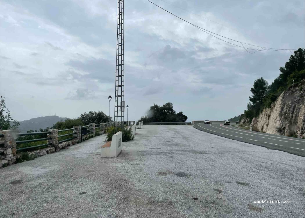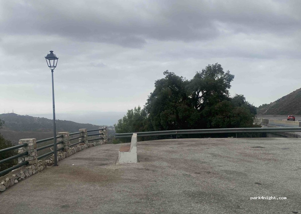 A parking lot next to the road with a good view of the village down on the hill. There are better places to stay overnight, as it smells a bit of urine and the road is a bit noisy.