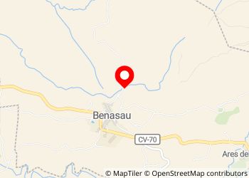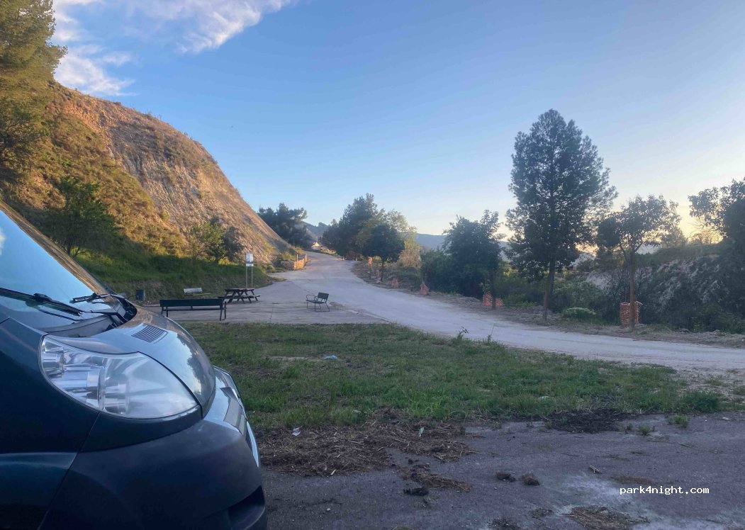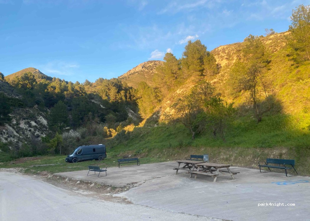 Aire de picnic à côté du chemin en sortie du village de Benasau. Route assez étroite pour y aller. Ok sans problème pour un van H3 L3 donc un CC pas trop gros. 2 tables de picnic et des bancs sur l’aire sans ombre. Très calme