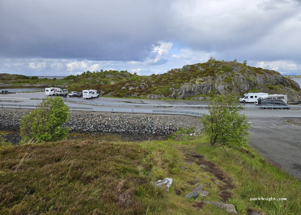 Kleiner Parkplatz neben der Atlantikstraße, mit der Möglichkeit auf einen kleinen Spaziergang nach hinten auf die Inseln. Allerdings ist die Straße stark befahren und es ist nicht sonderlich ruhig hier.