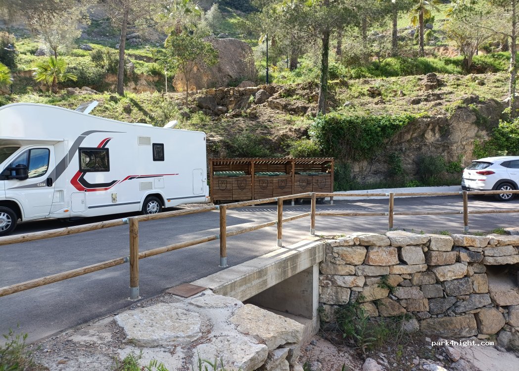 Al lado del comienzo de la vía Ferrata, en el puente hay una zona llana donde caben dos autocaravanas. está llano y se puede pasar la noche, no pasan coches. Hay una fuente en el jardín botánico, pero pilla lejos para llenar la autocaravana. También hay cubos de basura.