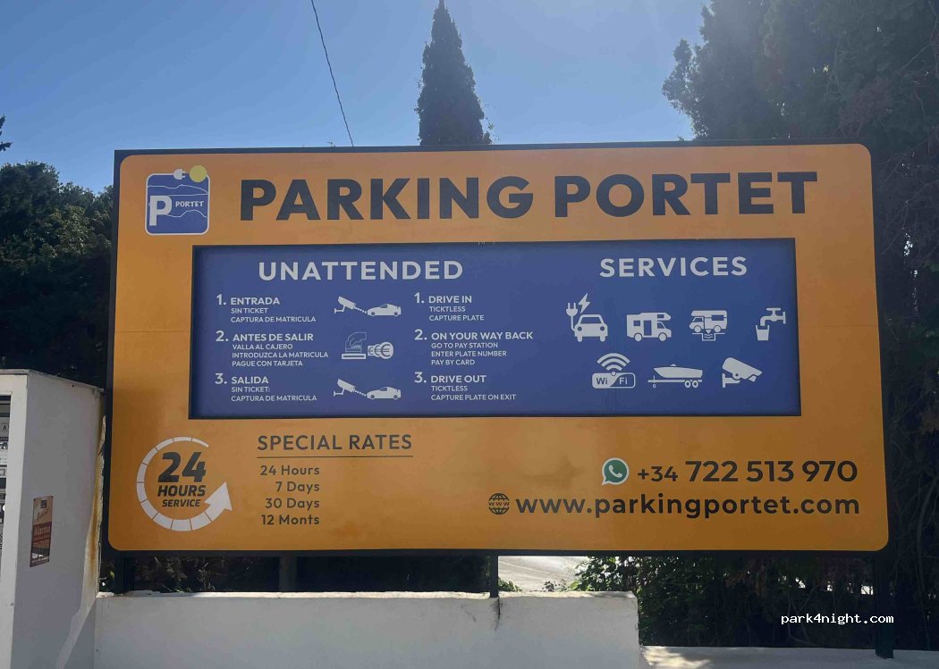 Parkeren bij El Portet (24 uur) is betaald, inclusief een grijswateropvanggebied, een kraan om schoon water te vullen en stopcontacten worden geïnstalleerd. De entree is geschikt voor grote busjes en campers.