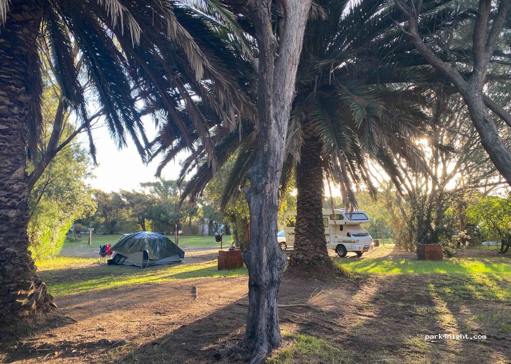 Campsite with 80 pitches on grass. Many permanent residents, who are separated from the campers. Each pitch with braai, electricity, garbage bin and water. Old-fashioned toilet block, but clean and good. Lots of shade from trees. Large bushes as good protection against the wind. Campsite is a few minutes walk from Long Beach. Campsite is a good starting point to visit everything between Cape Town and the Cape of Good Hope. Shopping center a few km away in Noordhoek.