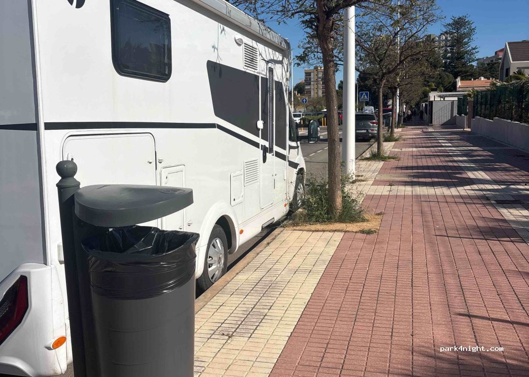 Plazas de parking en paralelo a la circulacion a ambos lados de la avenida. Algun sitio sombrio, pero principalmente a pleno sol. No muy lejos del paseo maritimo y de zonas con restaurantes y tiendas. Ligero desnivel.