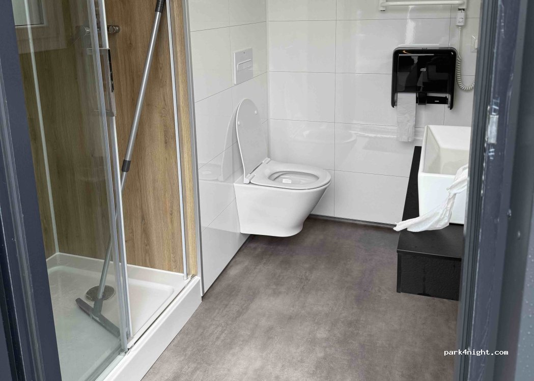 Platz noch im Bau, Stand Mai 2025 gibt es 4 WC/Dusch Kabinen (top modern und sauber), Entsorgung von Grauwasser, Schwarzwasser und Camperclean Automat, sowie Frischwasser. Aktuell noch keine Küche/Waschmaschine/Wäschetrockner verfügbar. Stellplätze sind tw. sehr uneben. Platz ist nah zur Autobahn, mit entsprechendem Lärm. Ort und Bahnhaltestelle sind zu Fuss erreichbar.
