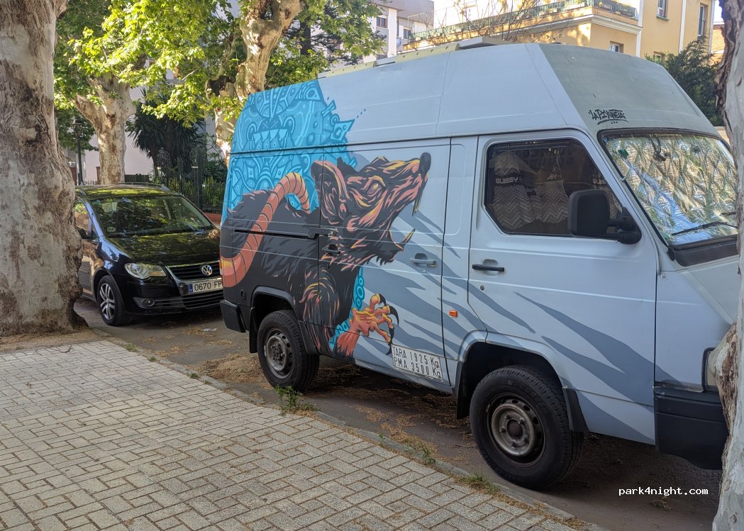 A street with free parking outside Málaga's low-emission zone, just steps from the beach, and shaded in the morning and fairly quiet.