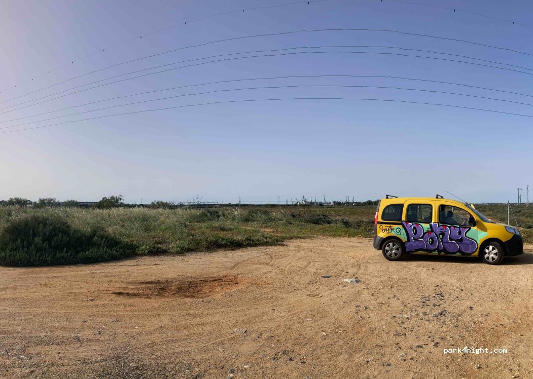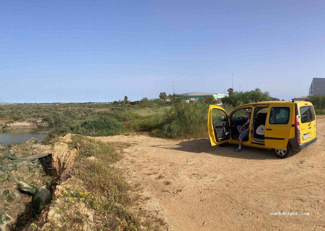 Hicimos una breve parada aquí para evitar el atasco. Apenas pasan coches. Zona industrial. Al lado hay un pequeño río. Sin sombra.