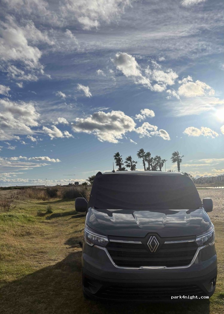 Je me suis garé 500 m au dessus sur la gauche, on est 5-6. Venteux car tempête en Espagne mais dans l’ensemble ça va, bien dormi et position au top, face a la mer