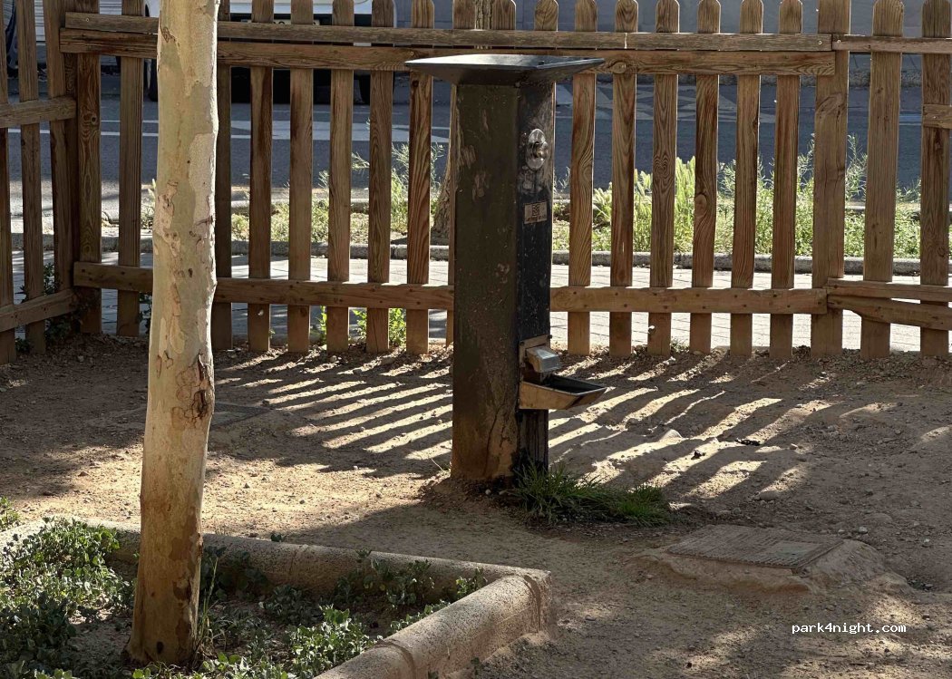 Pet park with a fountain for both dogs and us. There are also trash cans and play areas for the animals. There are also benches and shade. The dog park area is open from 7:00 a.m. to 11:00 p.m., but the benches and trash can are located outside the park.