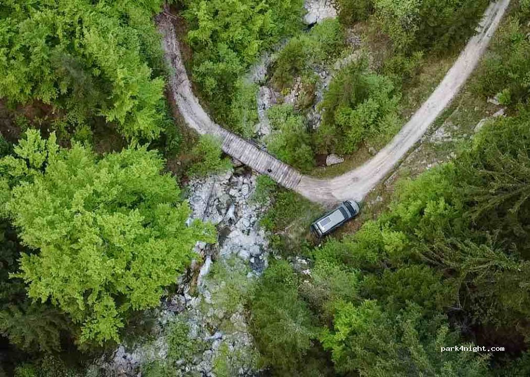 Wir parkten mit einem 4x4 Sprinter kurz vor der Holzbrücke am Bach. Super ruhige Nacht mit dem Geräusch von Wasser ... mehrere Wanderer kommen davor vorbei. Wir haben niemanden gesehen.