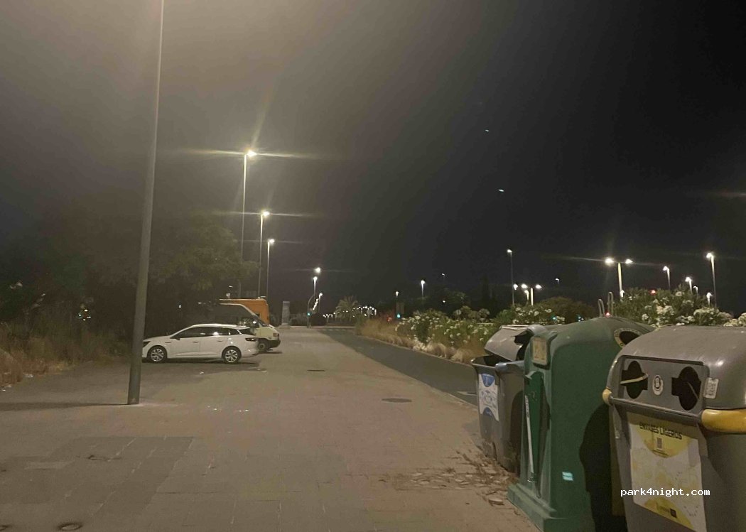 El aparcamiento es encima de una acera. Es bastante tranquilo de personas pero está al lado de la carretera con bastante tráfico incluso de noche. Con mucha basura, algo que no logro comprender teniendo contenedores bien cerca.
