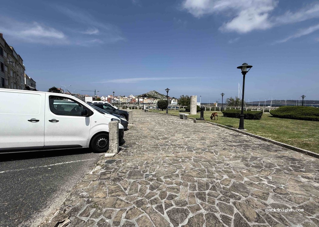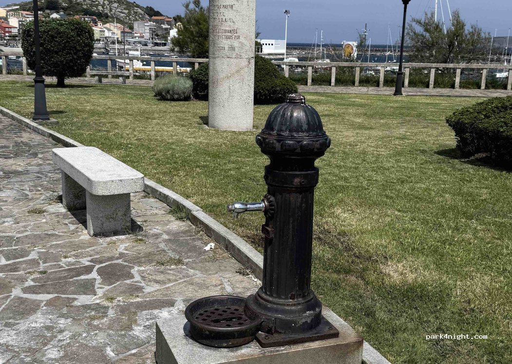 Fuente pública de agua potable en la calle principal con estacionamiento.