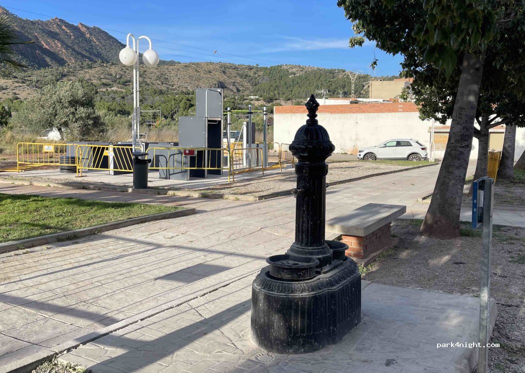 Fuente de agua potable disponible en el patio de juegos. Buen flujo, hay estacionamiento disponible cerca.
