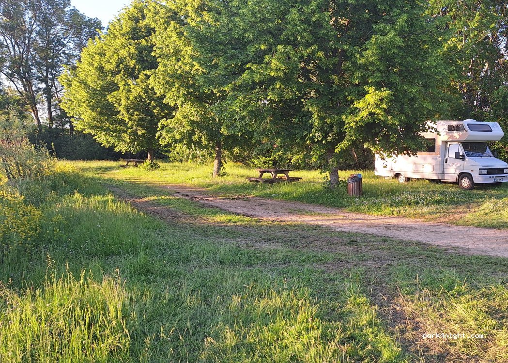 Grande aire picnic à l'écart de la départementale passante la journée mais très calme la nuit. Pour plus de tranquillité, nous sommes allés au fond de l'aire et derrière les arbres donc aucune vue sur la route.