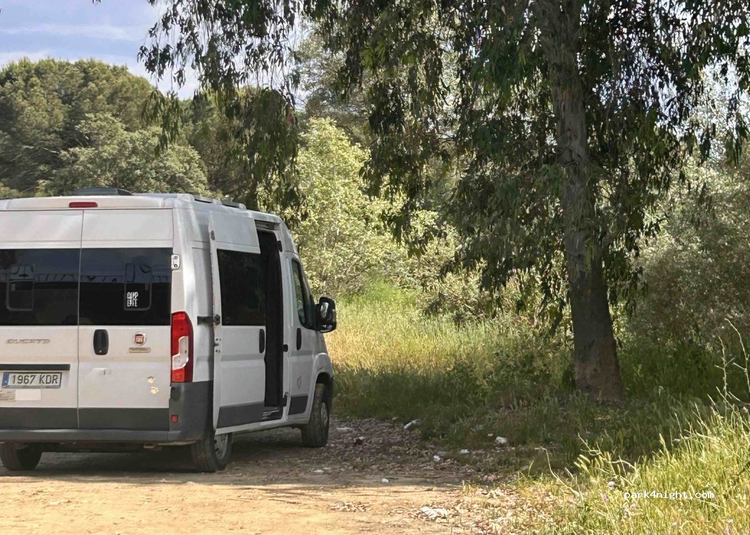 Es ist ein ruhiger Ort an der Straße, perfekt für einen Tagesstopp und um einen schönen Wanderweg zu genießen. Ich weiß nicht, ob du die Nacht hier verbringen kannst, ich glaube nicht, dass etwas passieren wird. Unter den Bäumen gibt es viel Schatten und der Fluss Guadiamar fließt hindurch. Dies ist das wildeste Gebiet mit einem grünen Korridor mit Picknickbereich und einem Gehweg über eine Holzbrücke über einen See direkt daneben.