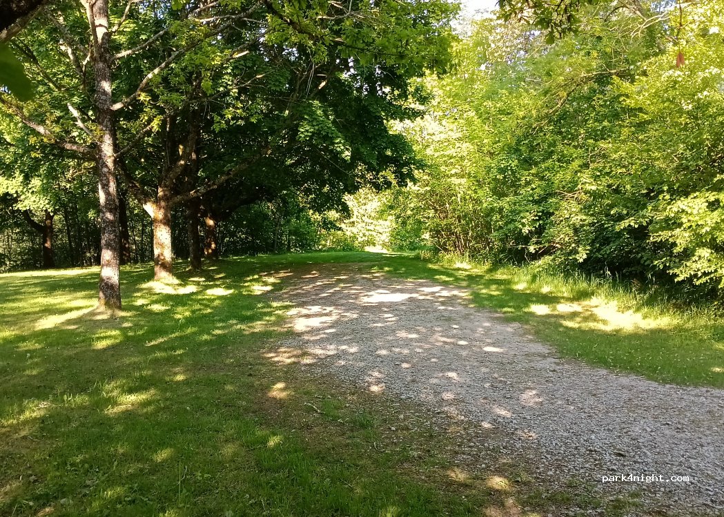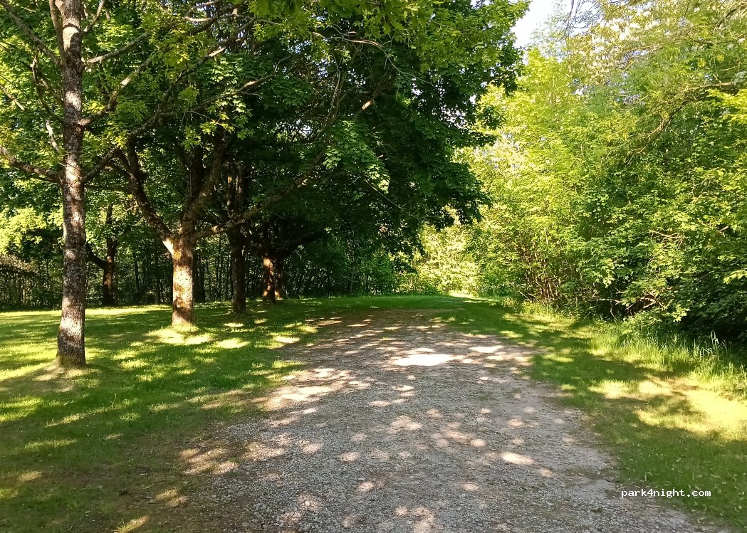 Parking randonneurs, situé au calme à la sortie du village sur une ancienne route fédérale, places de parking ombragées avec prairie ombragée