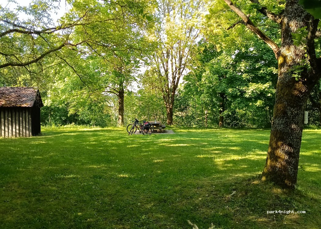 Schöner ruhiger Wanderparkplatz unter Bäumen mit Tisch und Bänken. Für Übernachtung geeignet. Keine V/E.