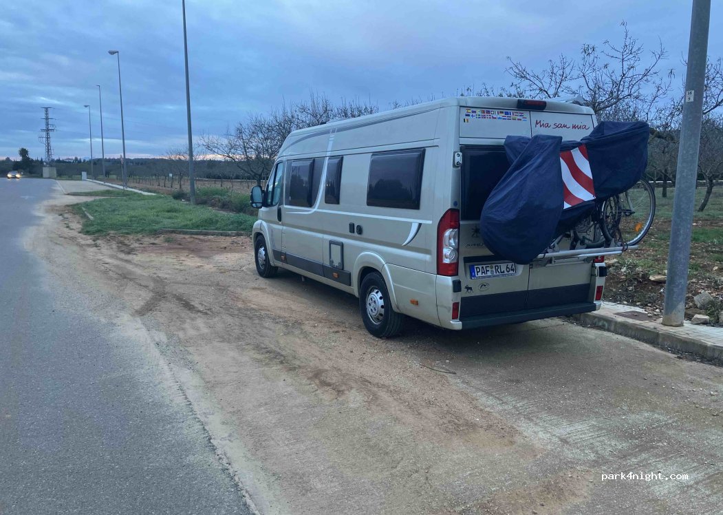 Viele Parkplätze in einem unfertigen Industriegebiet. Ich war an einem Freitagabend dort und es war ruhig. Nichts in der Umgebung außer Olivenbäumen und gelegentlichen Hundebesitzern. Wasser und Toiletten gab es auf einem Parkplatz am anderen Ende der Stadt, und die Sporthalle der Stadt erlaubte mir freundlicherweise zu duschen. In der Nähe des Ausgangspunkts der Wanderung zur Burg Xivert und den Ruinen der Altstadt, die einfach und definitiv lohnenswert ist.