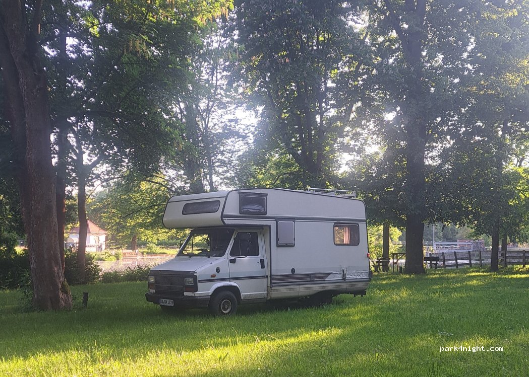 Der Stellplatz liegt wunderschön an einem Wehr in mitten grüner Wiese und Bäumen. Es gibt keinerlei Ver-und Entsorgung, die Toiletten des Café dürfen genutzt werden. Der Übernachtungspreis mit 20€ ist aus meiner Sicht etwas hoch, da keinerlei Service.