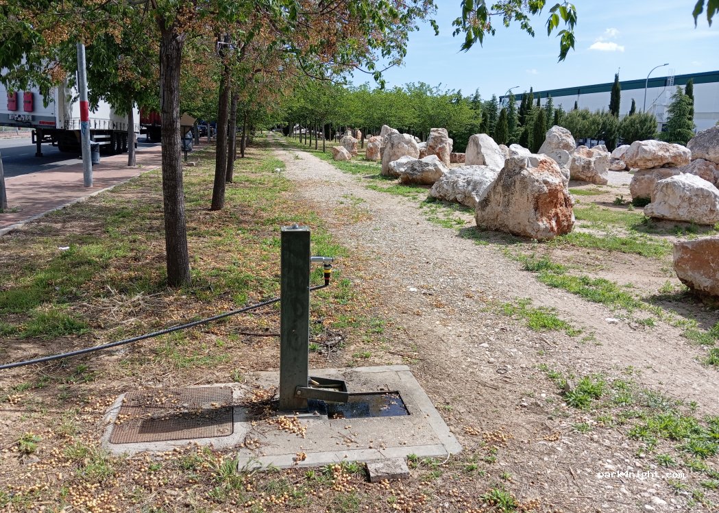 Tres fuentes de agua potable en un paseo a lo largo de un parque destinado al trianlong para bicicletas.