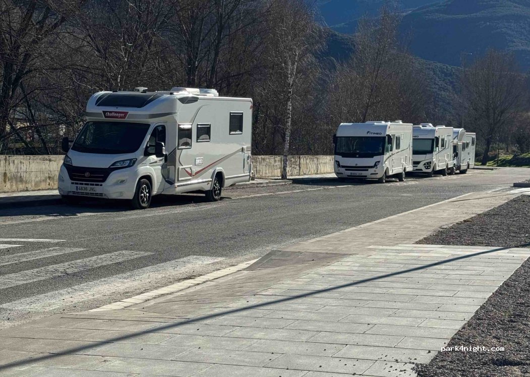 Parking ideal per deixar la furgo i anar a visitar el poble . Durant el dia molt animat ja que hi ha el poliesportiu i les piscines. Just davant hi ha el riu. A la nit molt tranquil , hi havia algunes Campers y AC. Es permet pernoctar tranquil·lament .